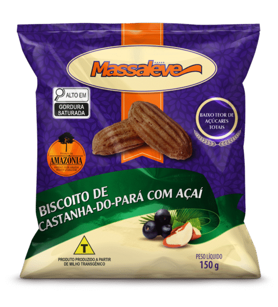 Farinha de trigo fortificada com ferro e ácido fólico, amido de milho (Agrobacterium tumefaciens e ou Bacullus thuringiensis e ou Streptomyces viridochromogenes), açúcar, e óleo de palma, polpa de açaí, castanha-do-Pará, ovo integral pasteurizado e sal. CONTÉM GLÚTEN.