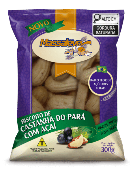 Farinha de trigo fortificada com ferro e ácido fólico, amido de milho (Agrobacterium tumefaciens e ou Bacullus thuringiensis e ou Streptomyces viridochromogenes), açúcar, e óleo de palma, polpa de açaí, castanha-do-Pará, ovo integral pasteurizado e sal. CONTÉM GLÚTEN.