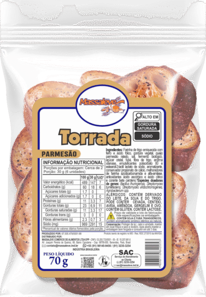 Farinha de trigo enriquecida com ferro e ácido fólico, fubá, gordura vegetal, queijo parmesão, sal, fermento biológico, açúcar cristal, fibra de trigo, enzima xilanase, emulsificantes polisorbato 80 e estearoil-2-lactil lactato de sódio, aromatizante, conservador propionato de cálcio, melhoradores de farinha azodicarbonamida e alfa-amilase, antioxidantes ácido ascórbico e ácido cítrico e corante beta caroteno. *Espécies doadoras de genes: Bacillus thuringiensis, Streptomyces tumefaciens, Streptomyces viridochromogenes, Agrobacterium spp. CONTÉM SOJA E FUBÁ TRANSGÊNICOS. CONTÉM AROMATIZANTE SINTÉTICO IDÊNTICO AO NATURAL.
